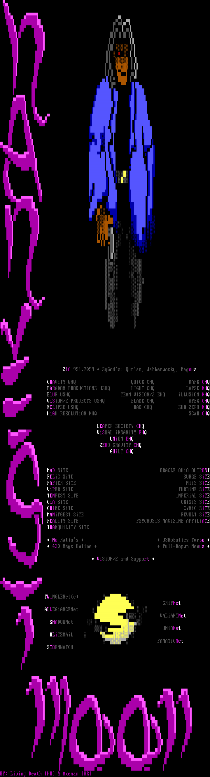GRAViTY WHQ QUiCK CHQ DARK CHQ PARADOX PRODUCTIONS USHQ LIGHT CHQ LAPSE NHQ BlUR USHQ TEAM VISION/2 EHQ iLLUSiON NHQ ViSiON/2 PROJECTS USHQ BLADE CHQ APEX CHQ ECLiPSE USHQ BAD CHQ SUB ZERO NHQ HiGH REZOLUTiON NHQ SCaR CHQ