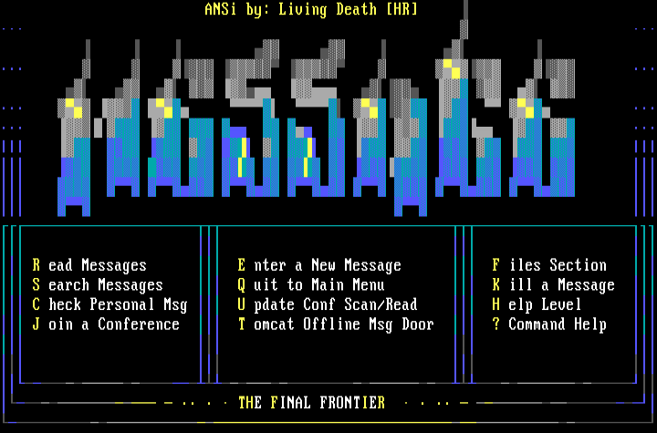 R ead Messages E nter a New Message F iles Section S earch Messages Q uit to Main Menu K ill a Message C heck Personal Msg U pdate Conf Scan/Read H elp Level J oin a Conference T omcat Offline Msg Door ? Command Help THE FINAL FRONTIER