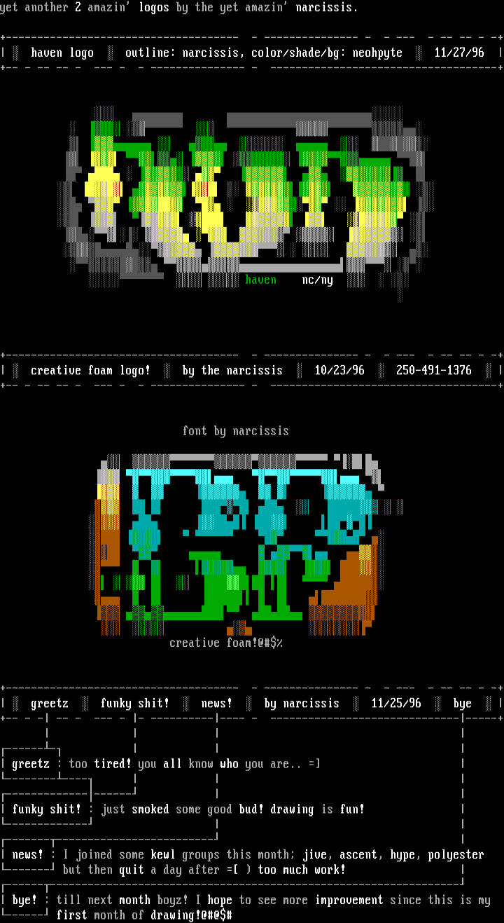 +------------------------------------- - --------------- - - --- - -- -- - -+ haven logo outline: narcissis, color/shade/bg: neohpyte 11/27/96 +-- - -- -- - --- - - --------------- - ------------------------------------+