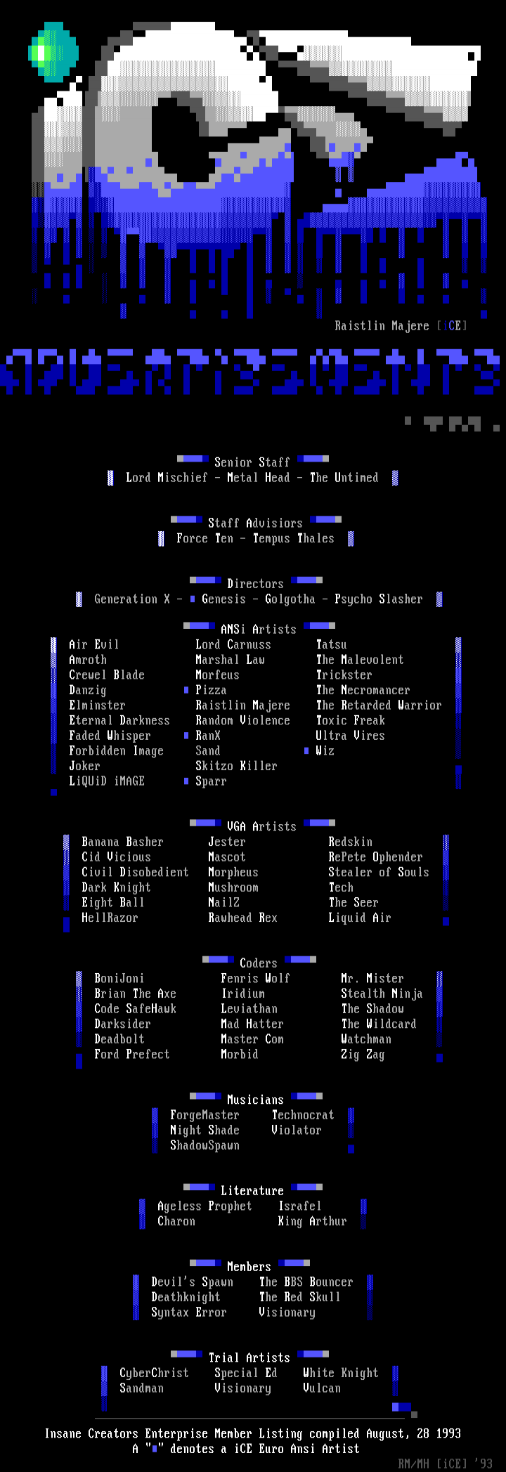Insane Creators Enterprise Member Listing compiled August, 28 1993