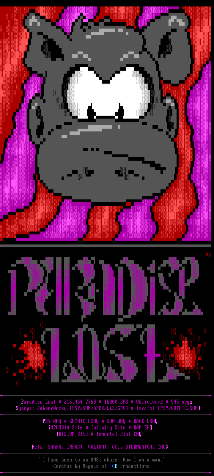 Sysops: JabberWocky PSY/SUN/APEX/LL2/GRV Israfel P