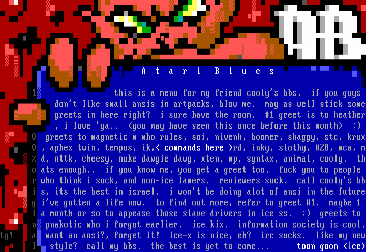 A t a r i B l u e s 1this is a menu for my friend coolys bbs. if you guys dont like small ansis in artpacks, blow me. may as well stick some greets in here right? i sure have the room. 1 greet is to heather , i love ya.. you may have seen this once before this month : 0greets to magnetic m who rules, soi, nivenh, boomer, shaggy, stc, krux 0, aphex twin, tempus, ik, commands here rd, inky, slothy, 28, mca, m d, nttk, cheesy, nuke dawgie dawg, xten, mp, syntax, animal, cooly. th oats enough.. if you know me, you get a greet too. fuck you to people rwho think i suck, and non-ice lamers. reviewers suck. call coolys bb is, its the best in israel. i wont be doing alot of ansi in the future give gotten a life now. to find out more, refer to greet 1. maybe 1 ia month or so to appease those slave drivers in ice ss. : greets to npnakotic who i forgot earlier. ice kix. information society is cool.tg! awant an ansi?, forget it! ice-x is nice, eh? irc sucks. like my new lstyle? call my bbs. the best is yet to come... toon goon ice
