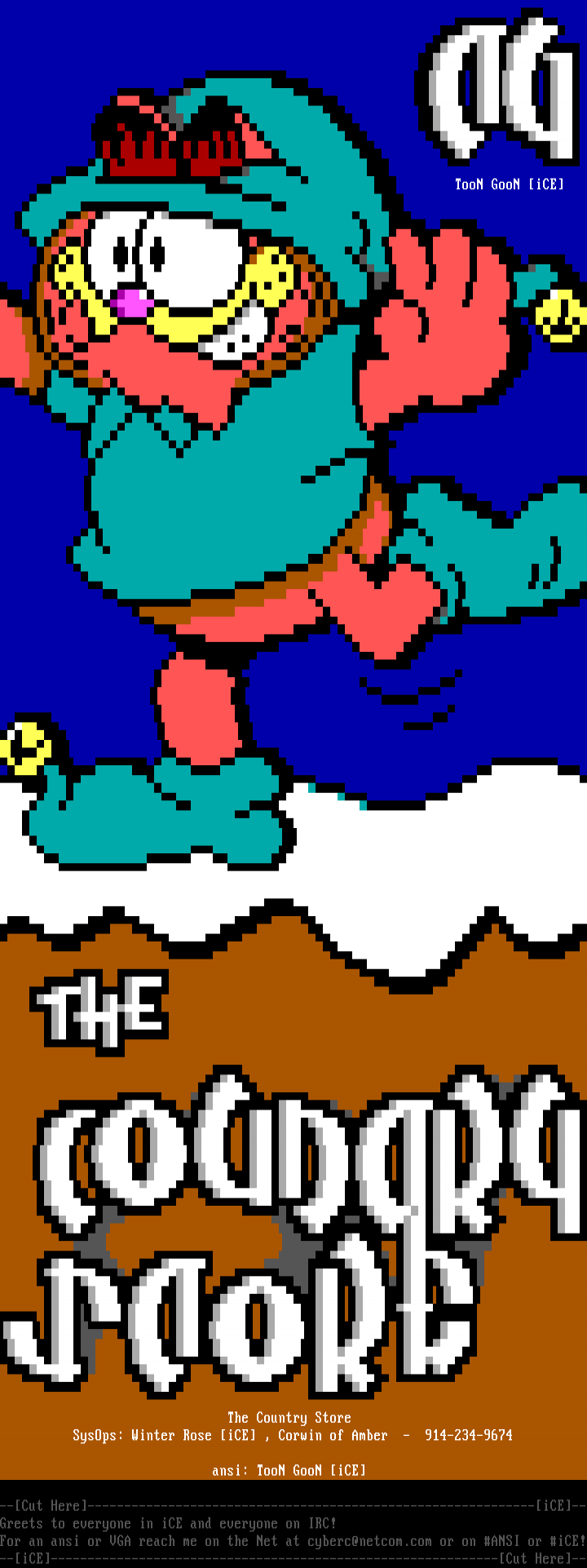 For an ansi or VGA reach me on the Net at cyberc@netcom.com or on ANSI or iCE!--iCE-------------------------------------------------------------Cut Here--