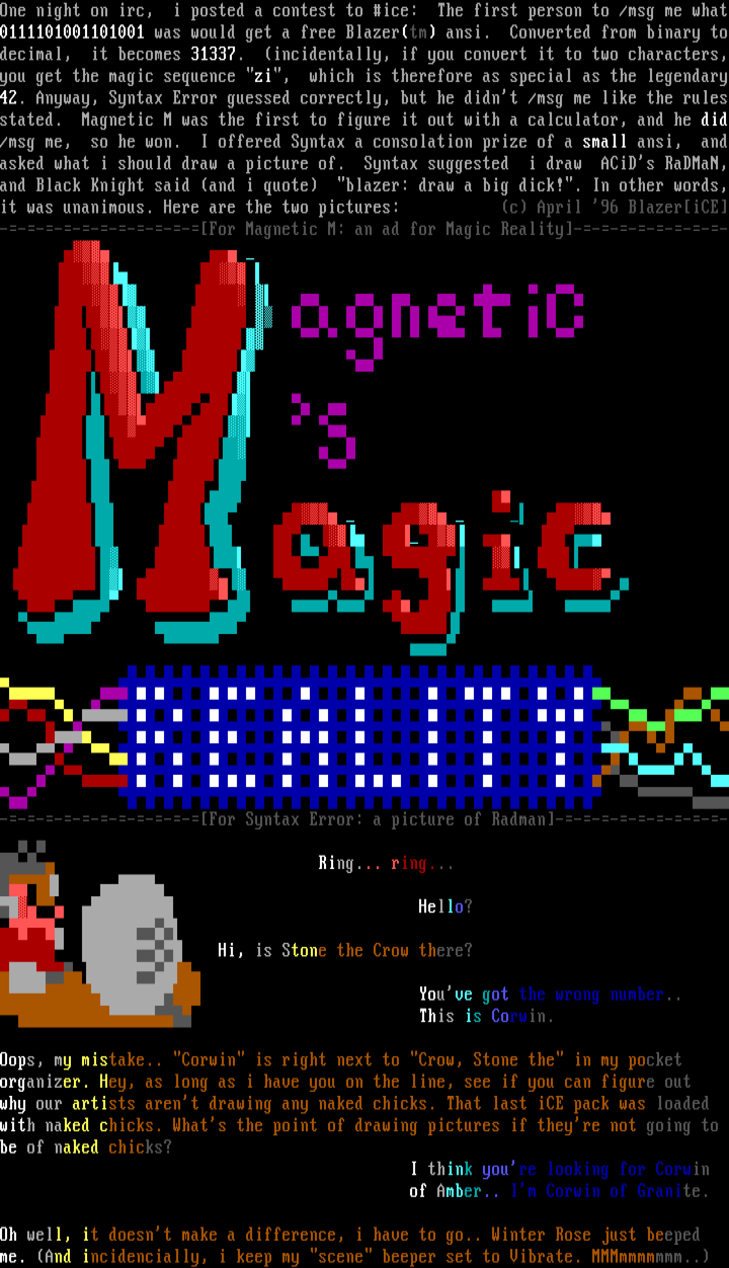 One night on irc, i posted a contest to ice: The first person to /msg me what0111101001101001 was would get a free Blazertm ansi. Converted from binary todecimal, it becomes 31337. incidentally, if you convert it to two characters,you get the magic sequence zi, which is therefore as special as the legendary42. Anyway, Syntax Error guessed correctly, but he didnt /msg me like the rulesstated. Magnetic M was the first to figure it out with a calculator, and he did/msg me, so he won. I offered Syntax a consolation prize of a small ansi, andasked what i should draw a picture of. Syntax suggested i draw ACiDs RaDMaN,and Black Knight said and i quote blazer: draw a big dick!. In other words,it was unanimous. Here are the two pictures: c April 96 BlazeriCE-----------For Magnetic M: an ad for Magic Reality---------26