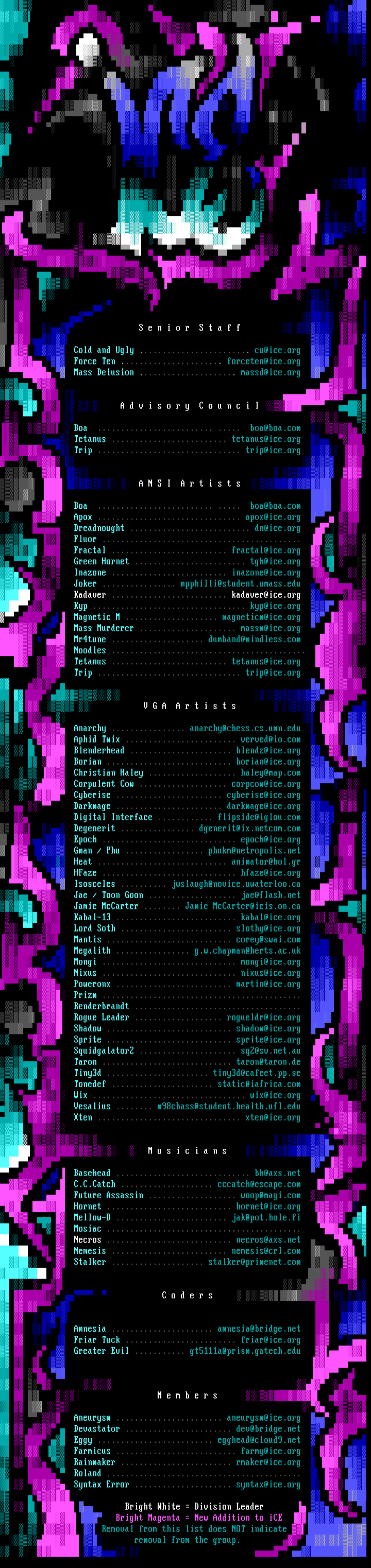 S e n i o r S t a f f Cold and Ugly ........................ cu@ice.org Force Ten ...................... forceten@ice.org Mass Delusion ..................... massd@ice.org A d v i s o r y C o u n c i l Boa ......................... ..... boa@boa.com Tetanus ......................... tetanus@ice.org