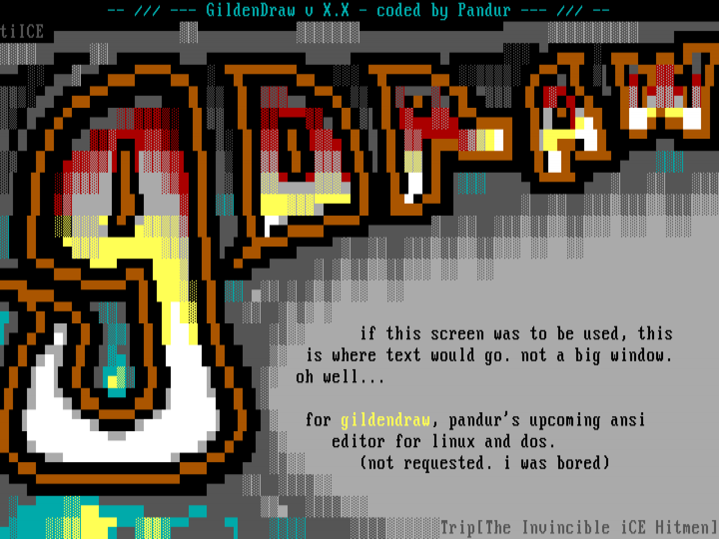 if this screen was to be used, this is where text would go. not a big window. oh well... for gildendraw, pandurs upcoming ansi editor for linux and dos. not requested. i was bored