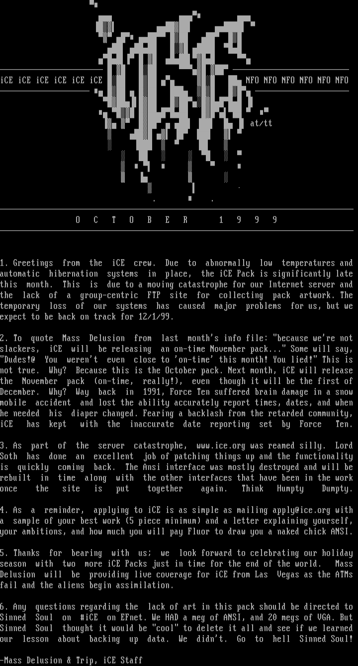 Sinned Soul on iCE on EFnet. We HAD a meg of ANSI, and 20 megs of VGA. But