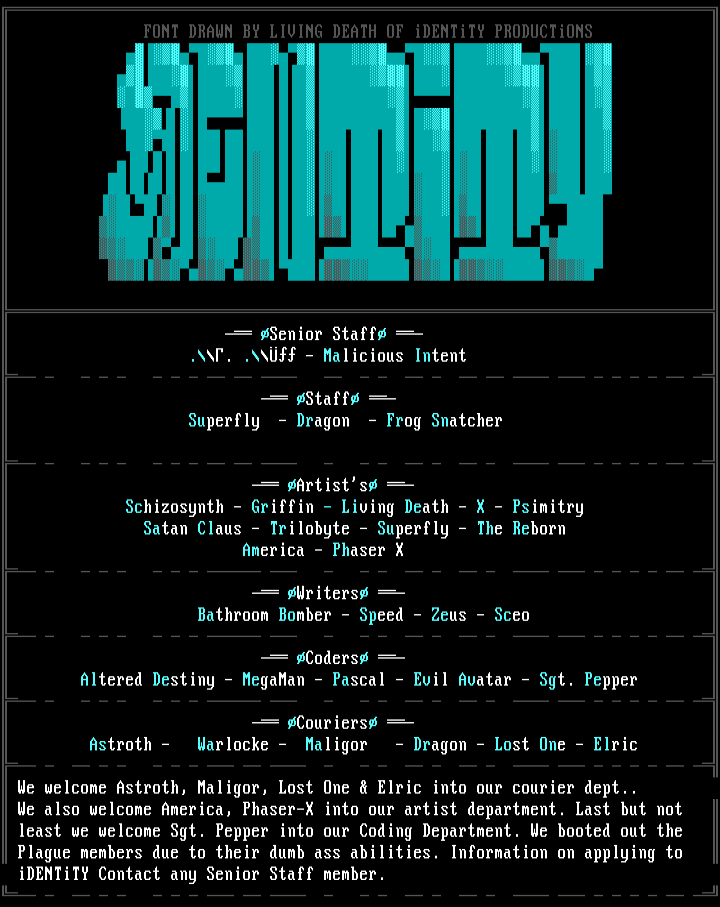 FONT DRAWN BY LIVING DEATH OF iDENTiTY PRODUCTiONS Senior Staff .. . - Malicious Intent Staff Superfly - Dragon - Frog Snatcher Artists Schizosynth - Griffin - Living Death - X - Psimitry Satan Claus - Trilobyte - Superfly - The Reborn America - Phaser X Writers Bathroom Bomber - Speed - Zeus - Sceo Coders Altered Destiny - MegaMan - Pascal - Evil Avatar - Sgt. Pepper Couriers Astroth - Warlocke - Maligor - Dragon - Lost One - Elric We welcome Astroth, Maligor, Lost One Elric into our courier dept..