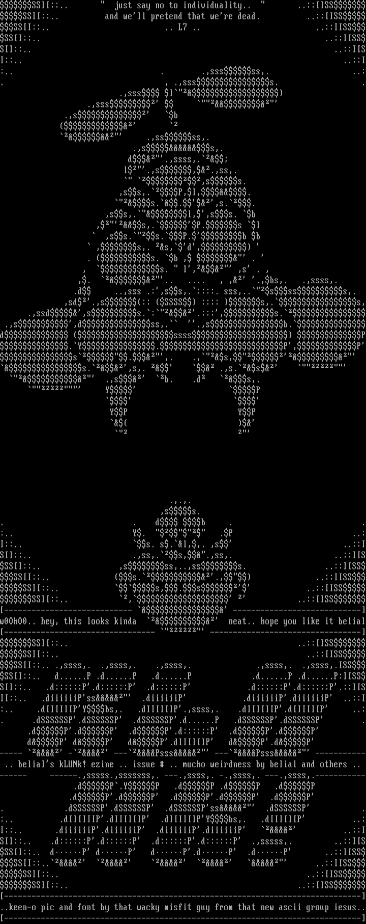 ----- - ---Psss ---Psss ----------- .. belials kLUNk! ezine .. issue .. mucho weirdness by belial and others ..