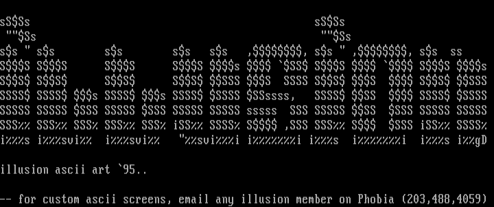 -- for custom ascii screens, email any illusion member on Phobia 203,488,4059