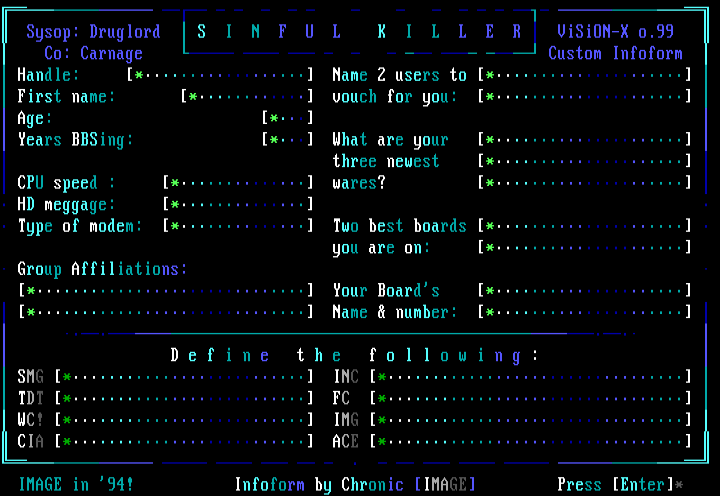 InfoformbyChronicIMAGEF LN RU K LIS I ELa:D gu: orlSgay p roC Co drnse9oo fuXCSm.m noV 9rifi NIOst o-Handle: Firstname: Age: YearsBBSing: ****CPUspeed: HDmeggage: Typeofmodem: ***GroupAffiliations:**Name2userstovouchforyou: **Whatareyour threenewest wares? ***Twobestboardsyouareon: **YourBoards Namenumber: ** iD et n :ln lf ohe i ge o wfSWMCG!IINMCGECCFATADITC********GM 9iE nI !A 4 tr n se E resP *