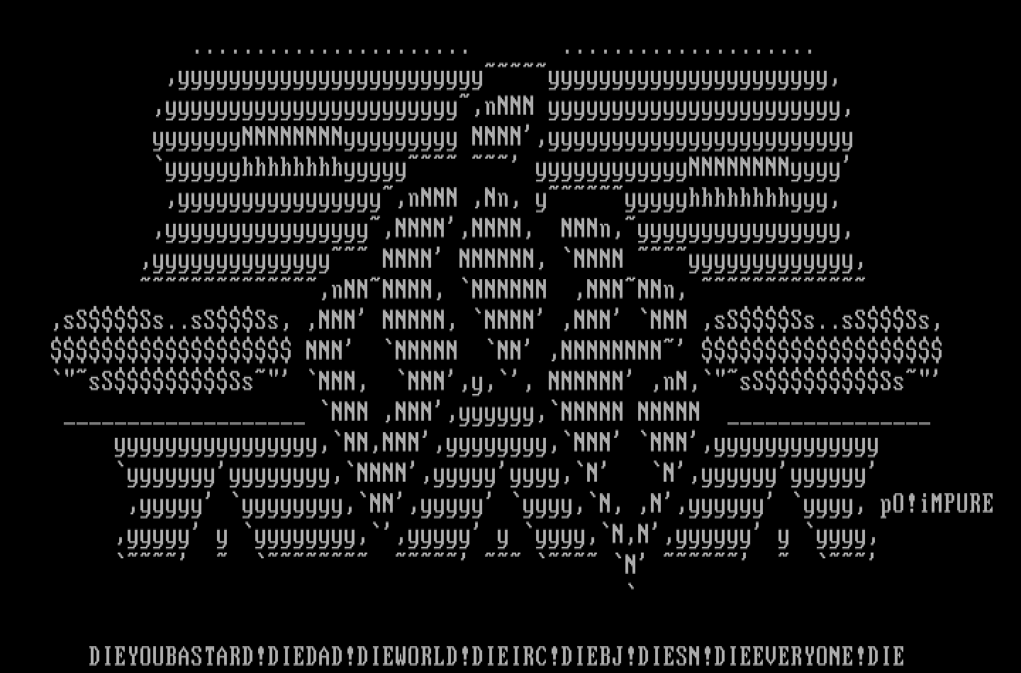 DIEYOUBASTARD!DIEDAD!DIEWORLD!DIEIRC!DIEBJ!DIESN!DIEEVERYONE!DIE