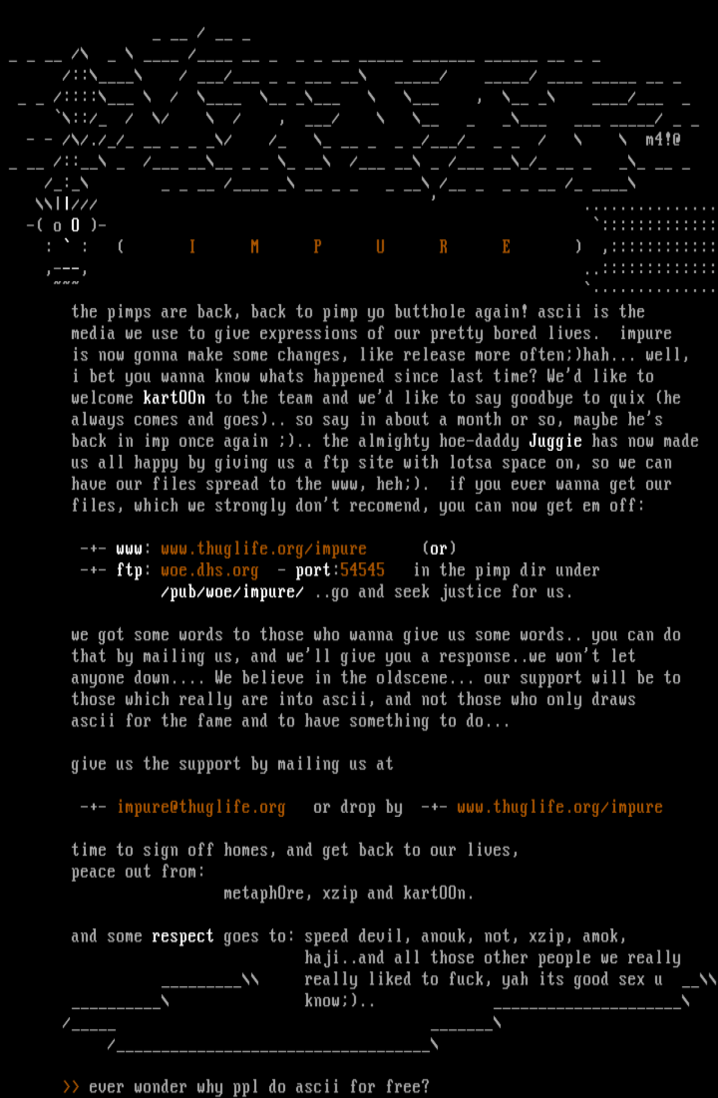 ............... - o O - ::::::::::::: : : I M P U R E ,:::::::::::: ,---, ..::::::::::::: the pimps are back, back to pimp yo butthole again! ascii is the