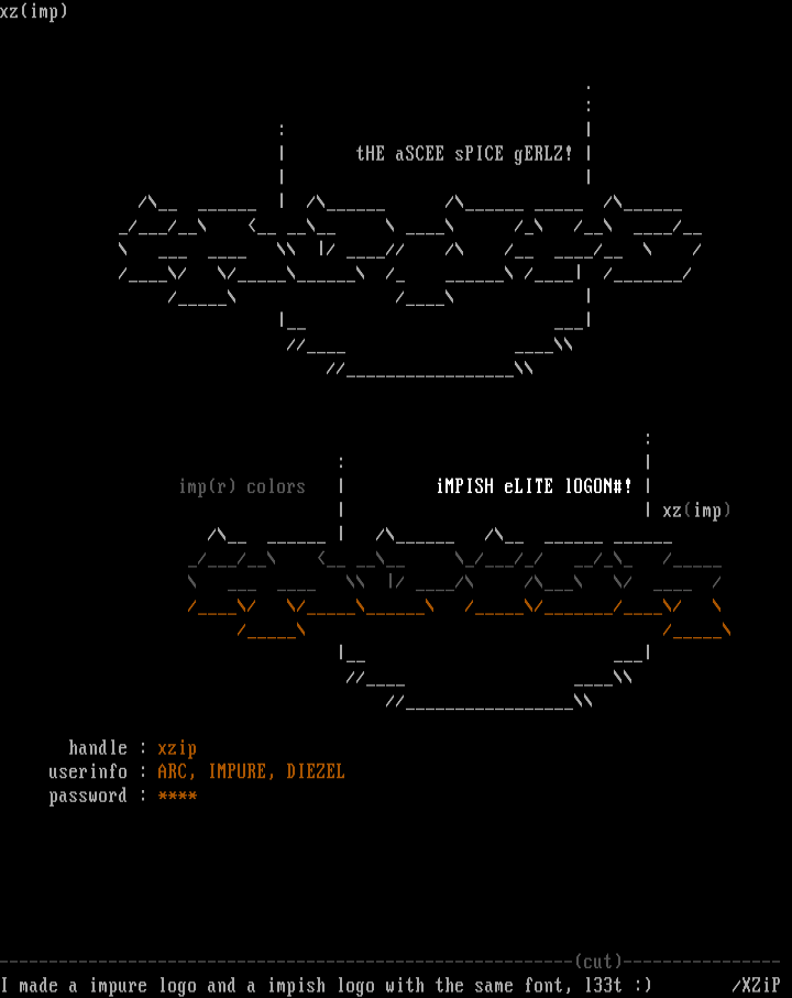 ----------------------------------------------------------cut---------------- I made a impure logo and a impish logo with the same font, l33t : /XZiP