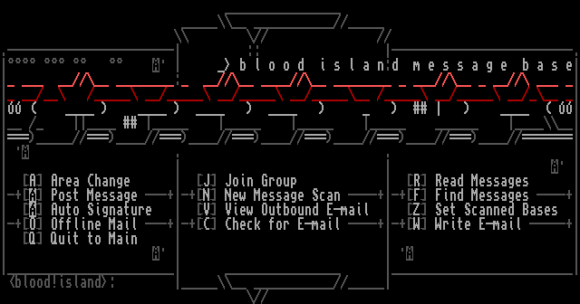 .----------------------- :: -------------------------. b l o o d i s l a n:d m e s s a g e b a s e // : // // // // / / / / / / / / / . . A Area Change J Join Group R Read Messages -+ Post Message ---+-+N New Message Scan ----+-+F Find Messages ----+ Auto Signature V View Outbound E-mail Z Set Scanned Bases -+O Offline Mail ---+-+C Check for E-mail ----+-+W Write E-mail -----+ Q Quit to Main blood!island: //