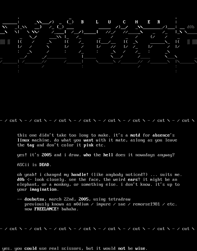 this one didnt take too long to make. its a motd for absences linux machine. do what you want with it mate, aslong as you leave the tag and dont color it pink etc.