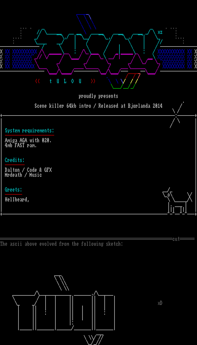 +----------------------------------------------------------------------:-------+ / / System requirements: -------------------- Amiga AGA with 020. 4mb FAST ram. Credits: -------- Dalton / Code GFX Mrdeath / Music Greets: / ------- o / Hellbeard, / . +--------------------------------------------------------------------------+