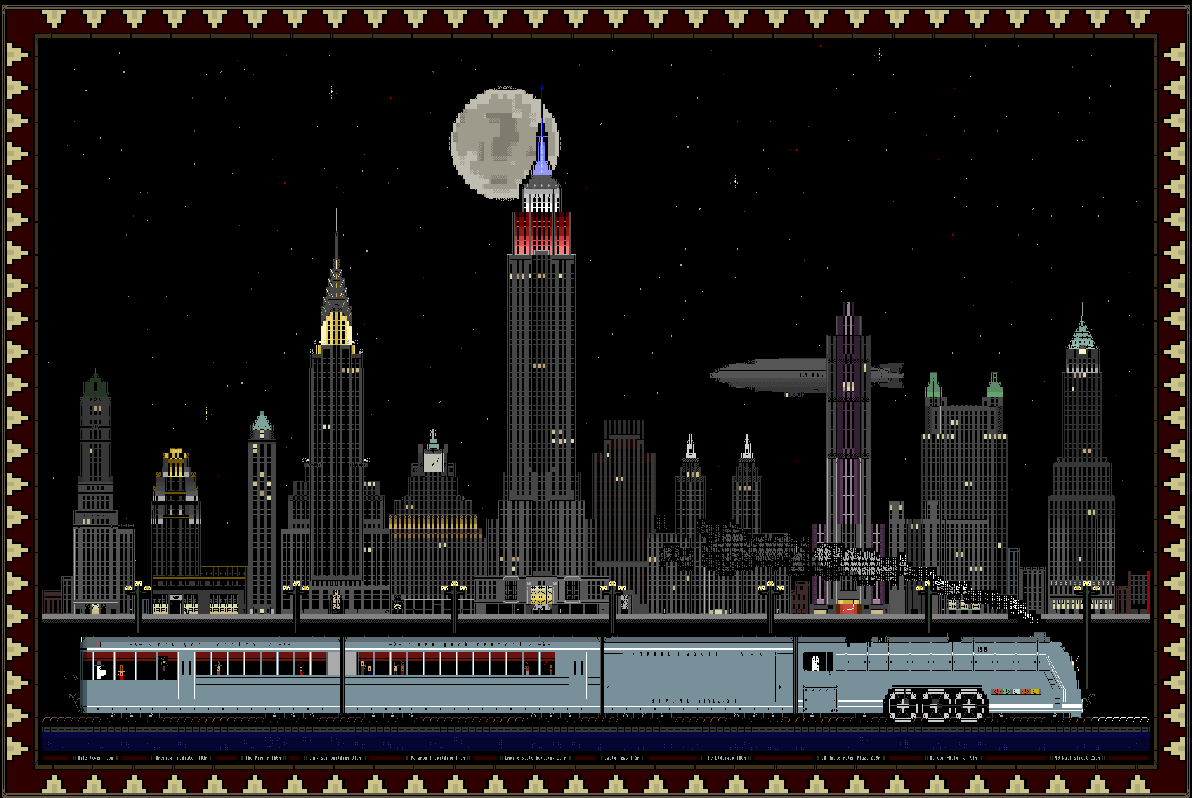 Ritz tower 165m American radiator 103m The Pierre 160m Chrylser building 319m Paramount building 119m Empire state building 381m daily news 145m The Eldorado 106m 30 Rockefeller Plaza 259m Waldorf-Astoria 191m 40 Wall street 255m