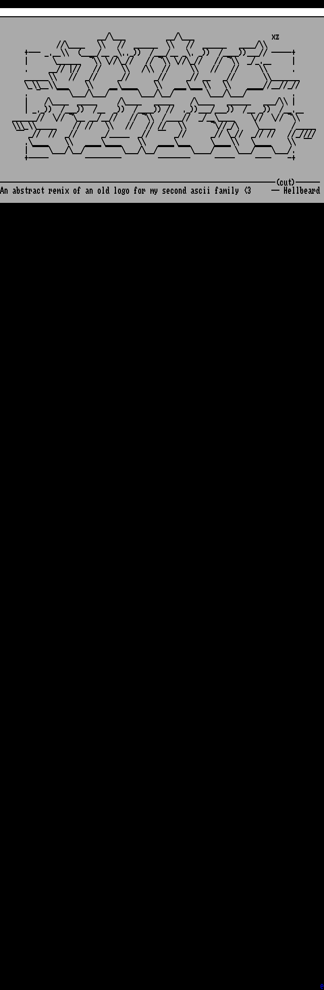 / / xz // // // / +--- . / .. // . -----+ // // /. . // // // / // // // . // // // // // // . // // // . / / / / . / / / // ./ / /. // // // / // // // // // // // / // // // / // // // // // // . // // / //. +----- --------- -------- ----- ---- -+ --------------------------------------------------------------------cut------ An abstract remix of an old logo for my second ascii family 3 -- Hellbeard