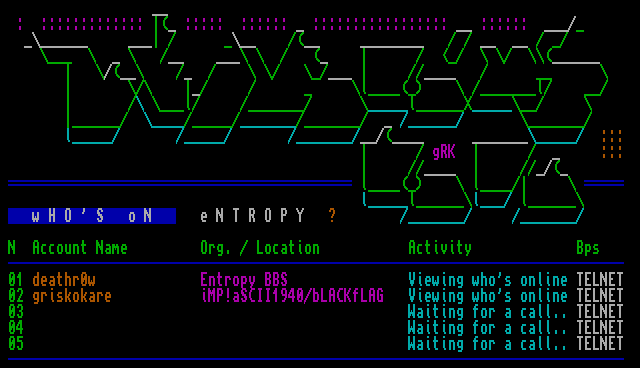 01 deathr0w Entropy BBS Viewing whos online TELNET
