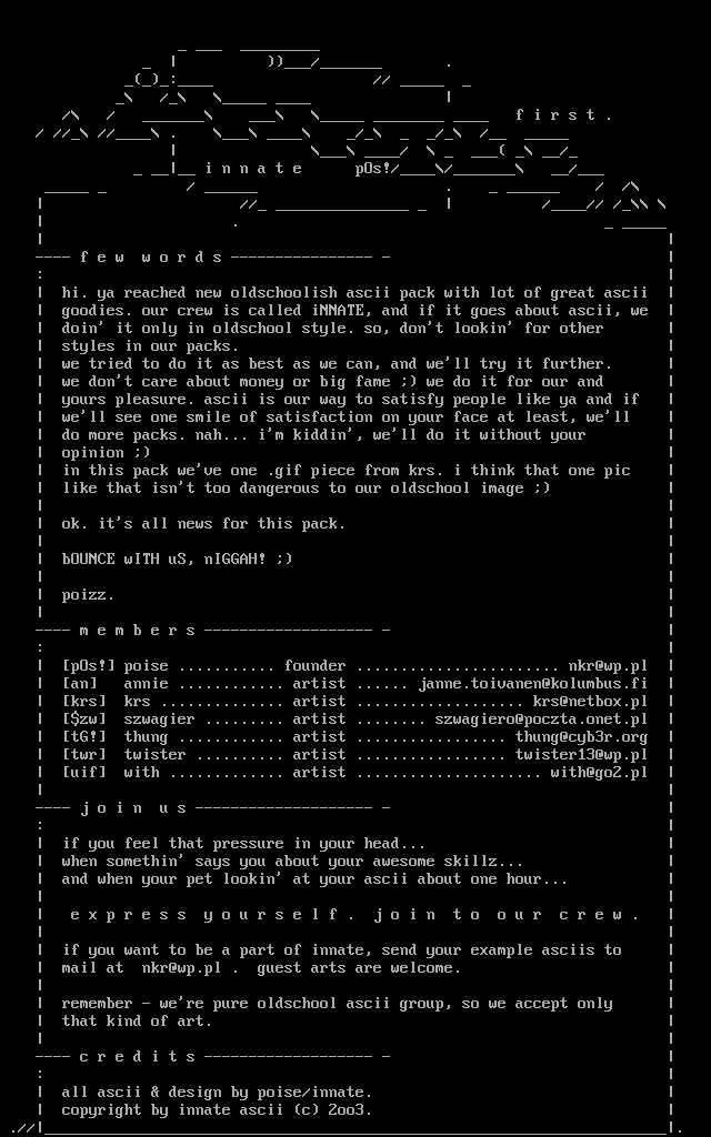 goodies. our crew is called iNNATE, and if it goes about ascii, we