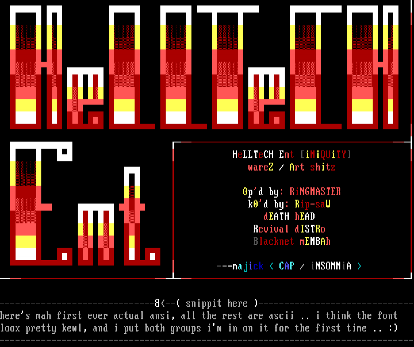 HeLLTeCH Ent iNiQUiTY wareZ / Art shitz 0pd by: RiNGMASTER k0d by: Rip-saW dEATH hEAD Revival dISTRo Blacknet mEMBAh ---majick CAP / iNSOMNiA