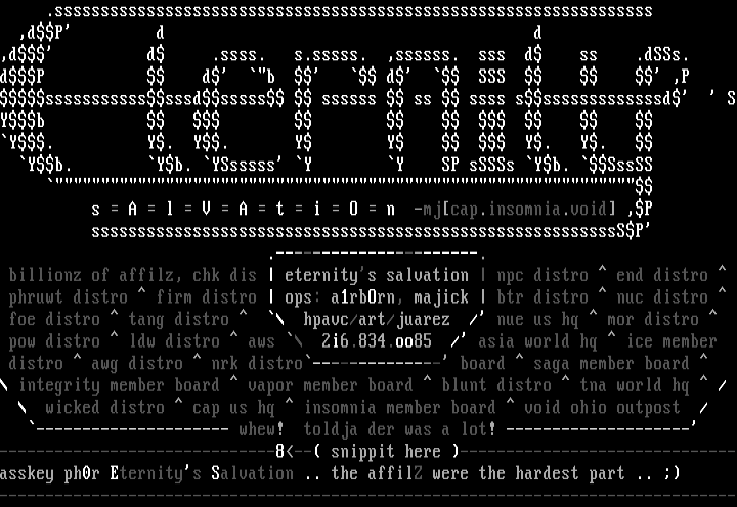 ------------------------------8-- snippit here ------------------------------asskey ph0r Eternitys Salvation .. the affilZ were the hardest part ..