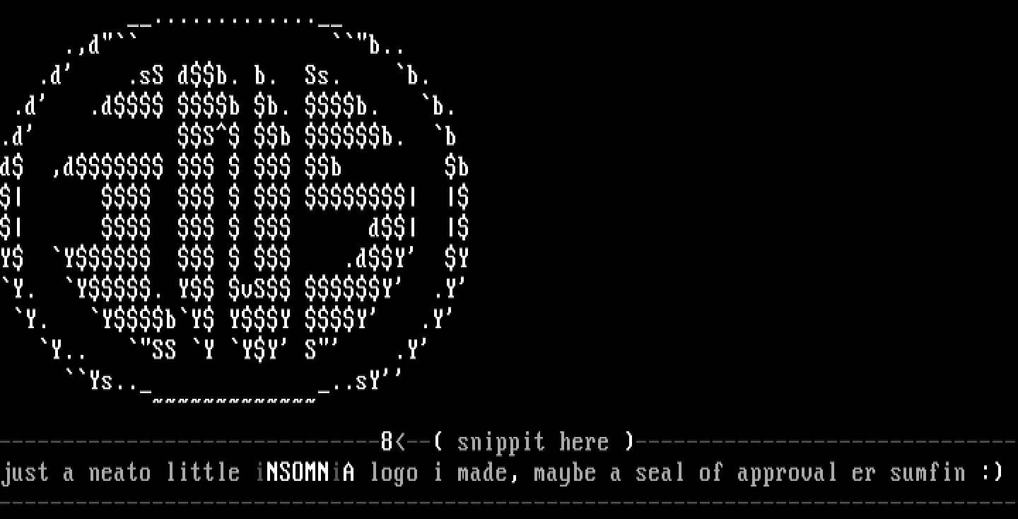 ------------------------------8-- snippit here ------------------------------just a neato little iNSOMNiA logo i made, maybe a seal of approval er sumfin :