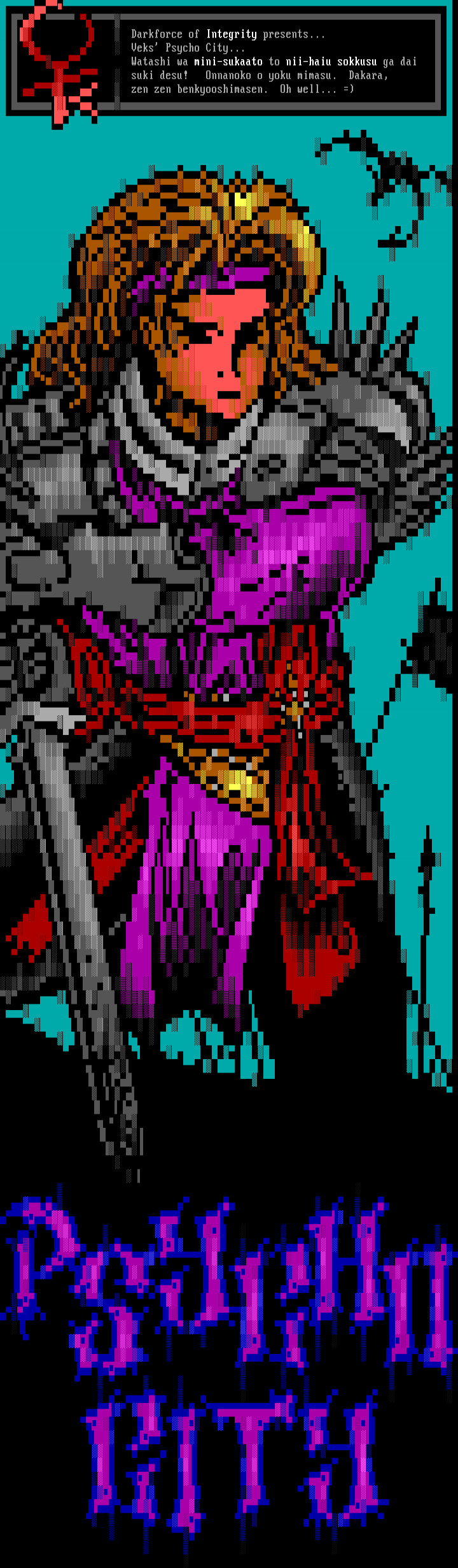 Darkforce of Integrity presents... Veks Psycho City... Watashi wa mini-sukaato to nii-haiu sokkusu ga dai suki desu! Onnanoko o yoku mimasu. Dakara, zen zen benkyooshimasen. Oh well...