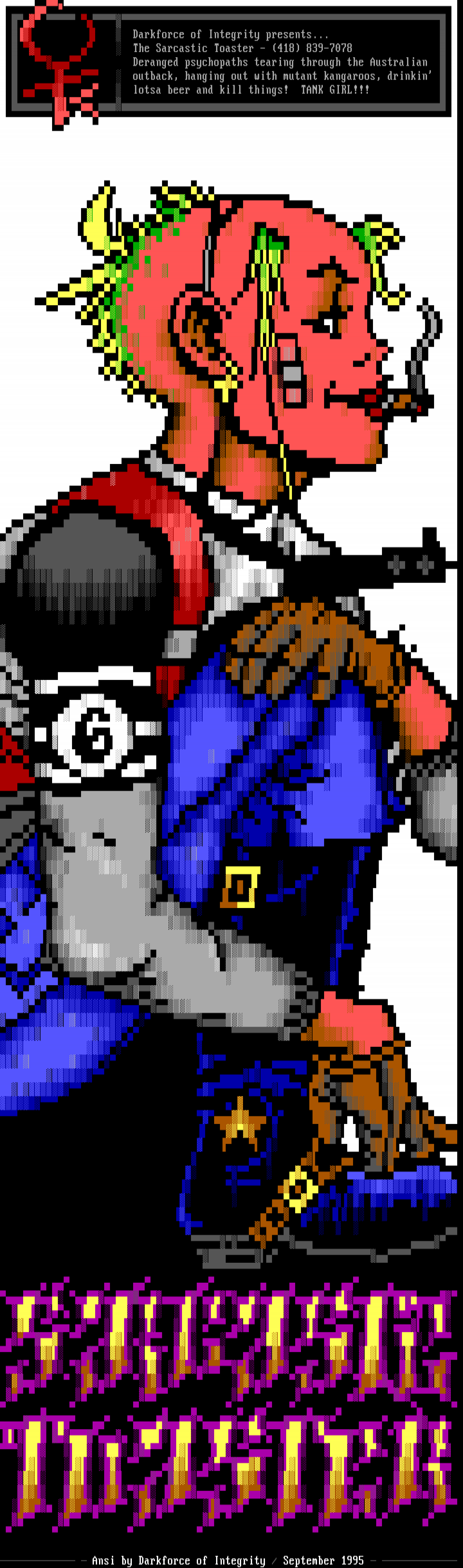 Darkforce of Integrity presents... The Sarcastic Toaster - 418 839-7078 Deranged psychopaths tearing through the Australian outback, hanging out with mutant kangaroos, drinkin lotsa beer and kill things! TANK GIRL!!!
