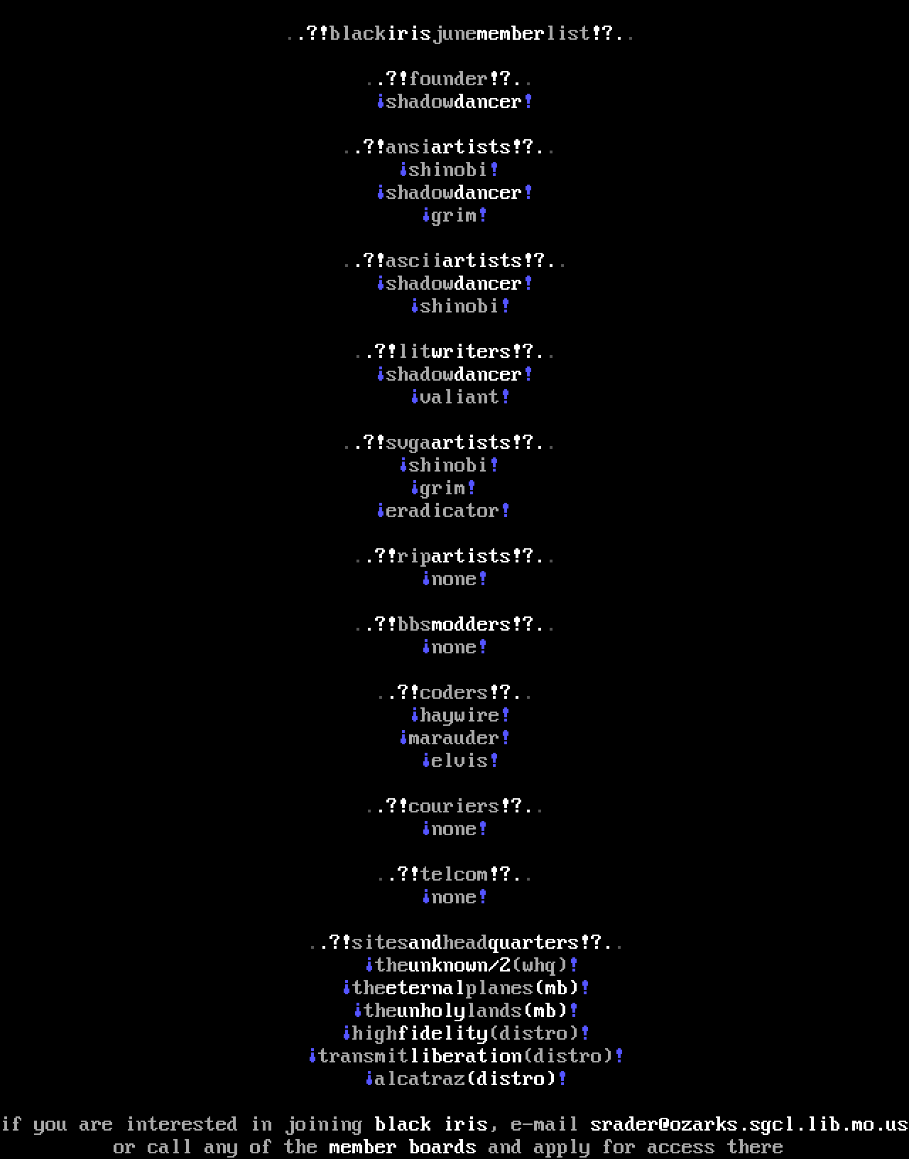 if you are interested in joining black iris, e-mail srader@ozarks.sgcl.lib.mo.u