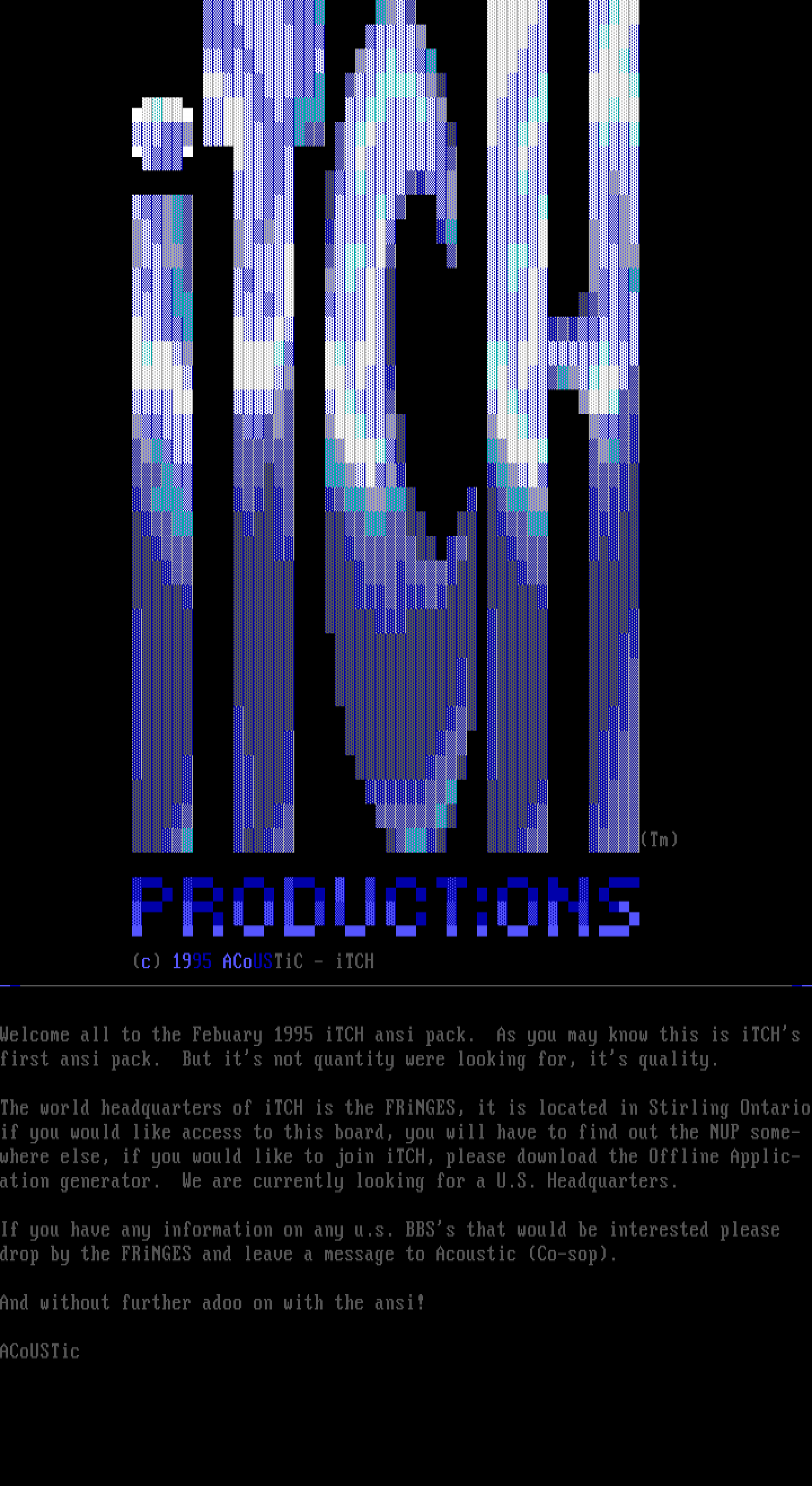 Welcome all to the Febuary 1995 iTCH ansi pack. As you may know this is iTCHs