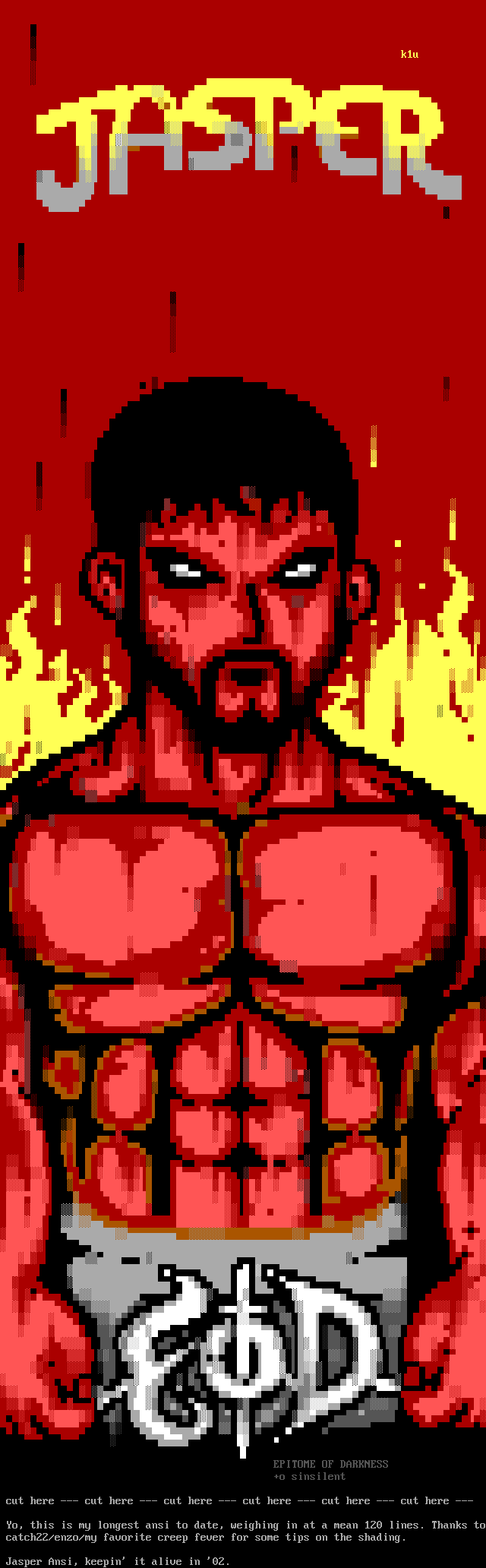 Yo, this is my longest ansi to date, weighing in at a mean 120 lines. Thanks to catch22/enzo/my favorite creep fever for some tips on the shading.