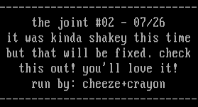 axiom (1) blatz (1) cheeze (1) dieznyik (1) flame (1) megadose (1) mighty mouse (1) misfit (1) mr self destruct (1) outkast (1) plastik (1) the joint (14) widowmaker (1)