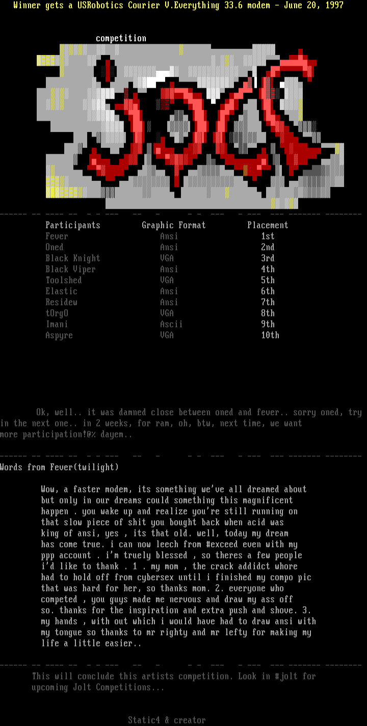 Winner gets a USRobotics Courier V.Everything 33.6 modem - June 20, 1997