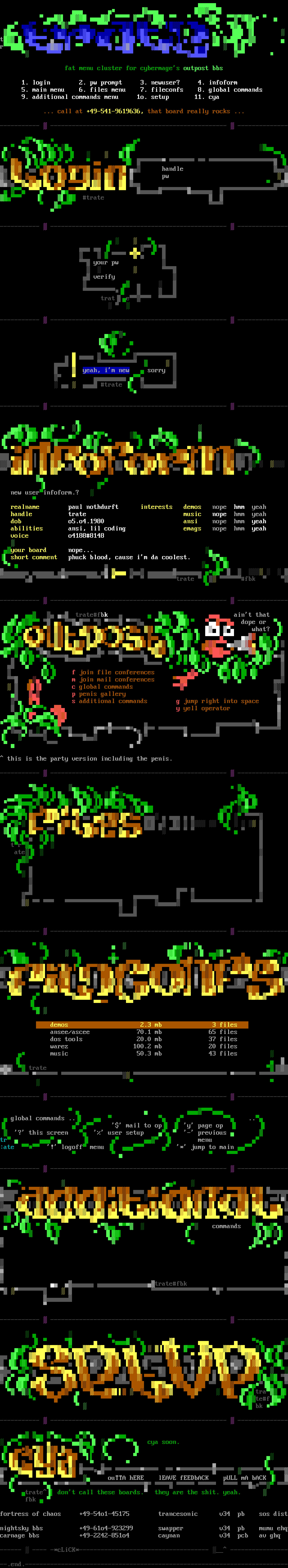 p fat menu cluster for cybermages outpost bbs bH LU 1. login 2. pw prompt 3. newuser? 4. infoform OC 5. main menu 6. files menu 7. fileconfs 8. global commands OK 9. additional commands menu 1o. setup 11. cya D