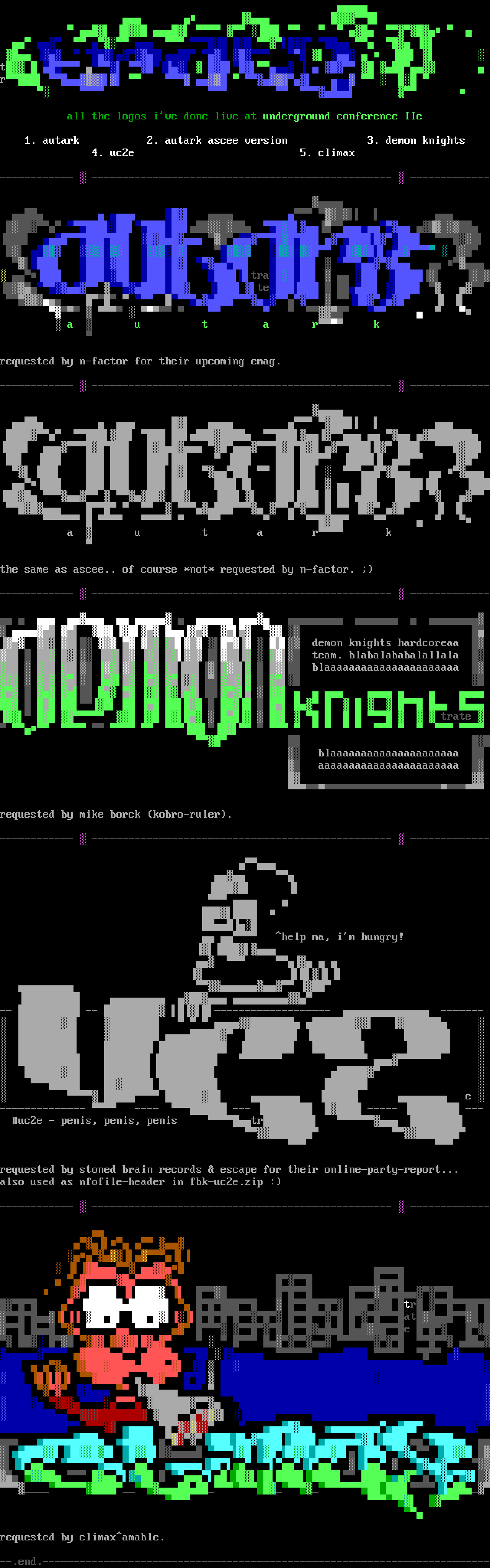 p bH all the logos ive done live at underground conference IIe LU OC 1. autark 2. autark ascee version 3. demon knights OK 4. uc2e 5. climax D ------------ ------------------------------------------------- -------------