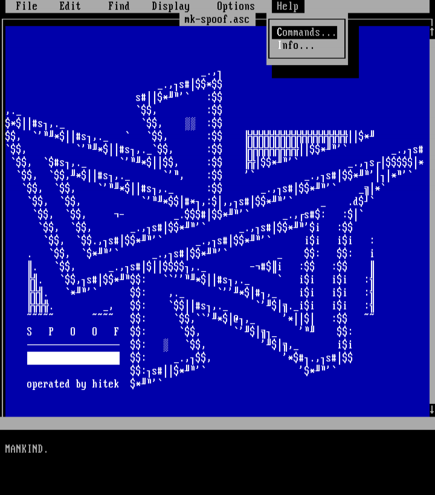mk-spoof.asc Commands... Info... ., .,s* s* : ,. , : *s,. , : , *s,. , : * , *s,., : * .,s , s,. *, : * .,s* , ,*s,. , : .,s** , , *s,. : .,s* * , , **,:,,s* .d , , - .* .,s: : , , .,s* .,s*i : , .,s* .,s* ii ii : . , * .,s* : : i . , .,s,. -i : : . ,s*: *s,. ii ii : . * : ,. *, ii ii : . , : s,. .ii ii : : ,*@, * : S P O O F : , : : , , ii : .,, *.,s :s* * operated by hitek *