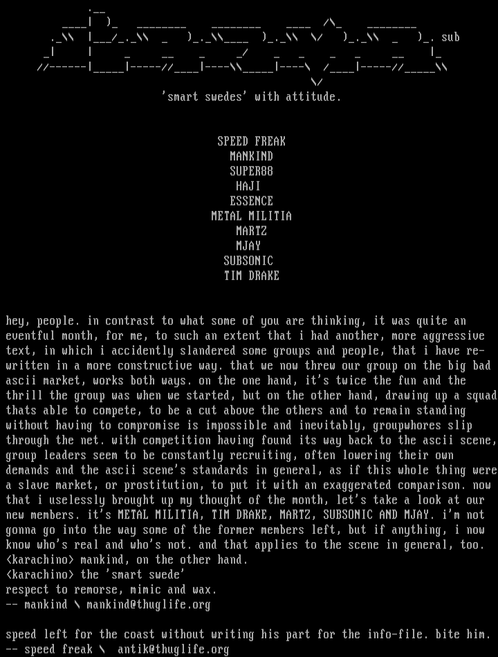 through the net. with competition having found its way back to the ascii scene, group leaders seem to be constantly recruiting, often lowering their own