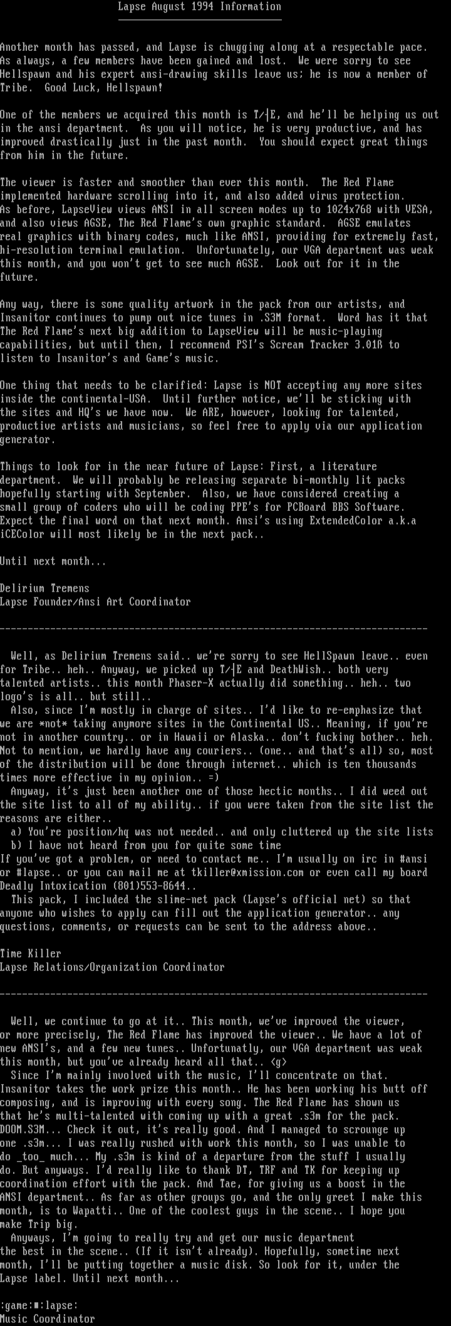 Lapse Founder/Ansi Art Coordinator