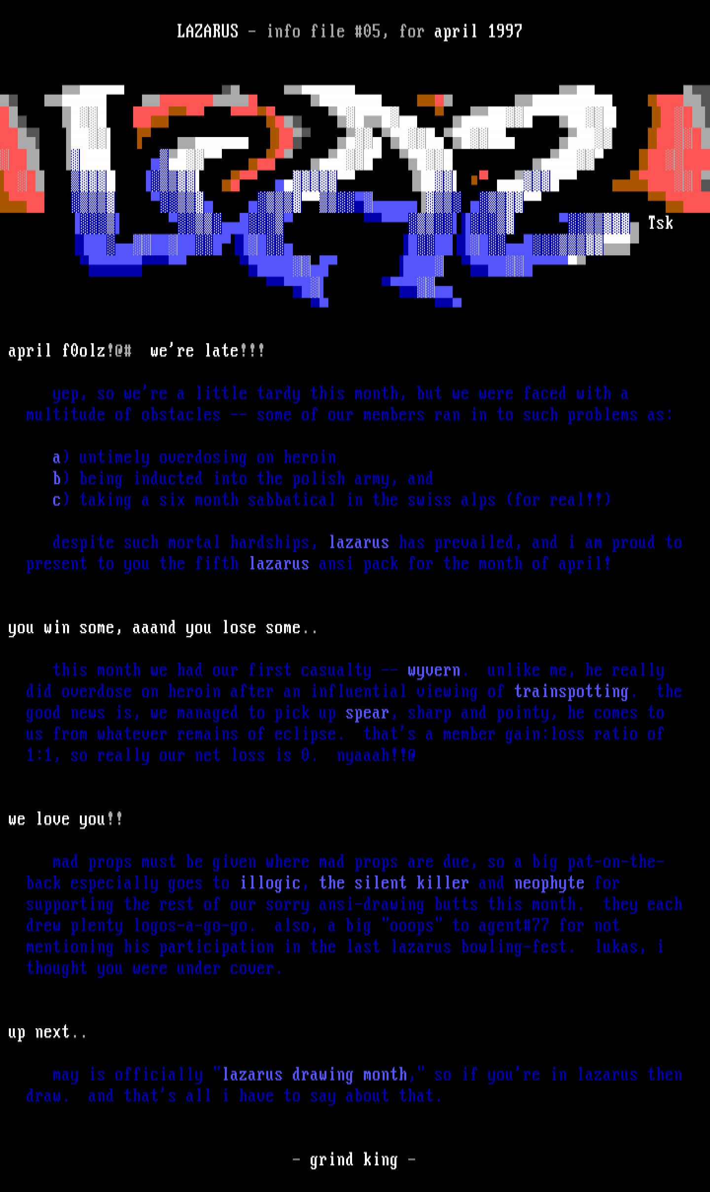 supporting the rest of our sorry ansi-drawing butts this month. they each