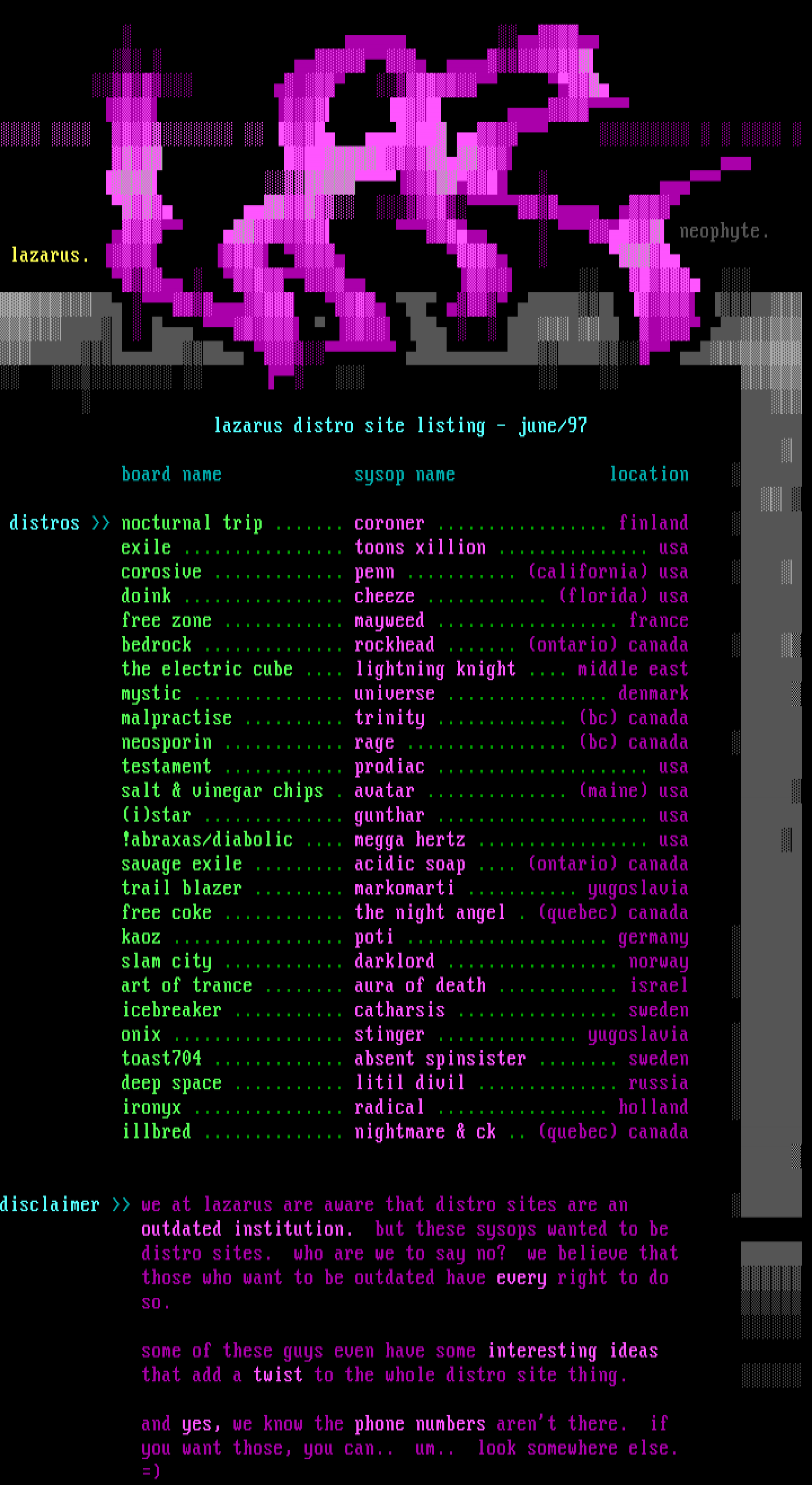 board name sysop name location distros nocturnal trip ....... coroner ................. finland exile ................ toons xillion ............... usa corosive ............. penn ........... california usa doink ................ cheeze ............ florida usa free zone ............ mayweed .................. france bedrock .............. rockhead ....... ontario canada the electric cube .... lightning knight .... middle east mystic ............... universe ................ denmark malpractise .......... trinity ............. bc canada neosporin ............ rage ................ bc canada testament ............ prodiac ..................... usa salt vinegar chips . avatar .............. maine usa istar .............. gunthar ..................... usa