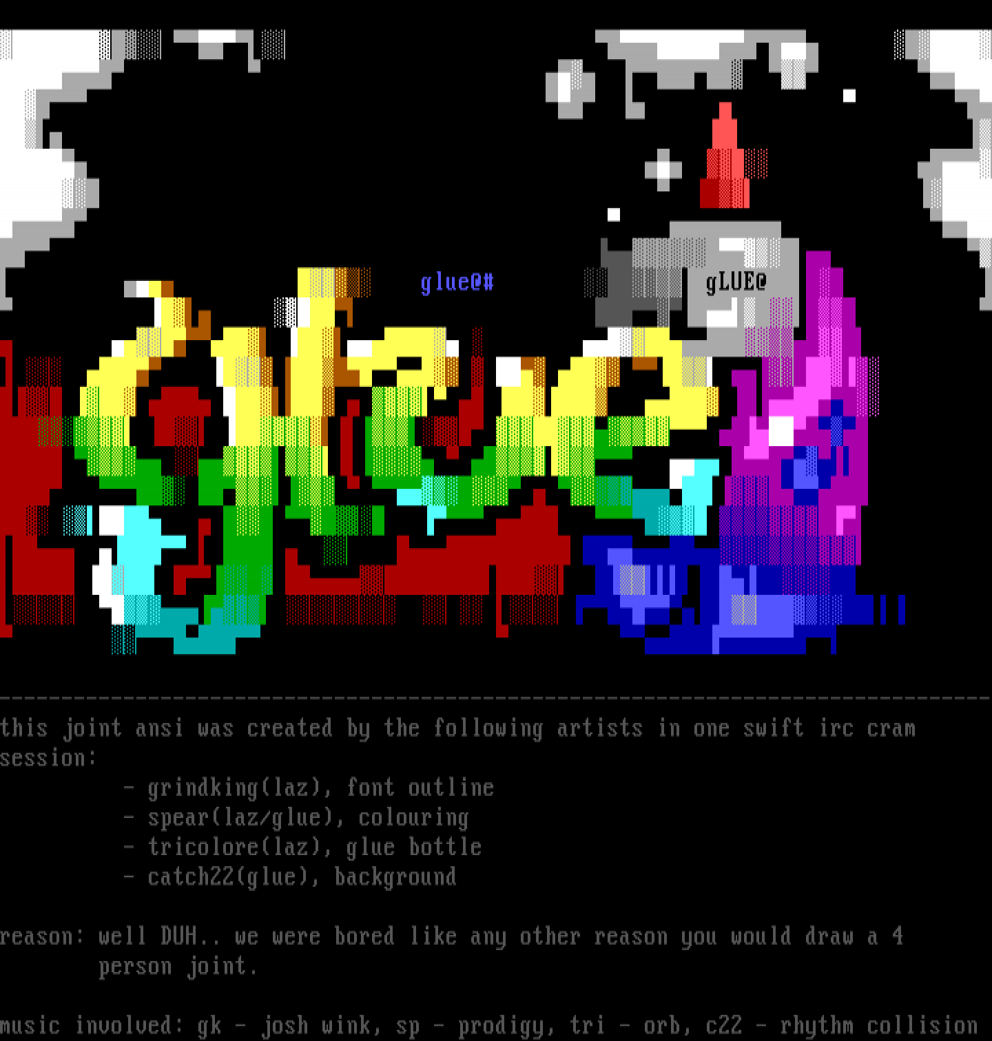 --------------------------------------------------------------------------------this joint ansi was created by the following artists in one swift irc cram