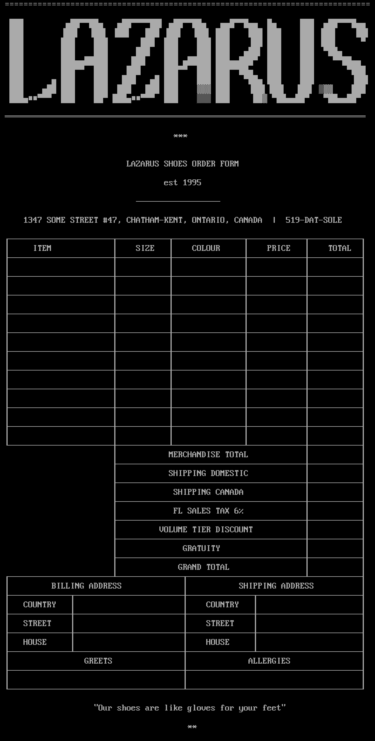LAZARUS SHOES ORDER FORM