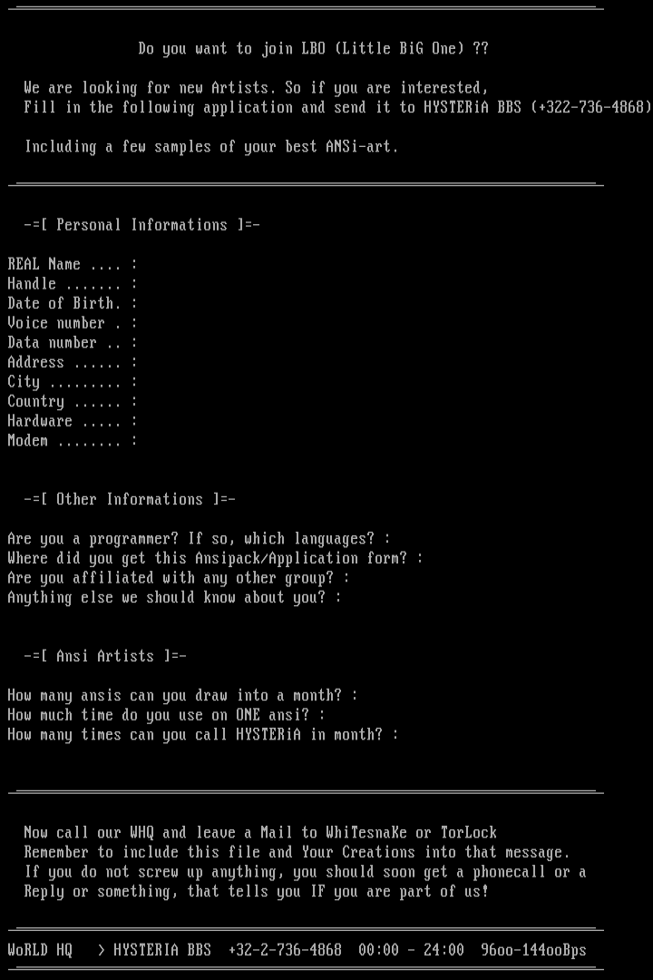 Fill in the following application and send it to HYSTERiA BBS +322-736-4868