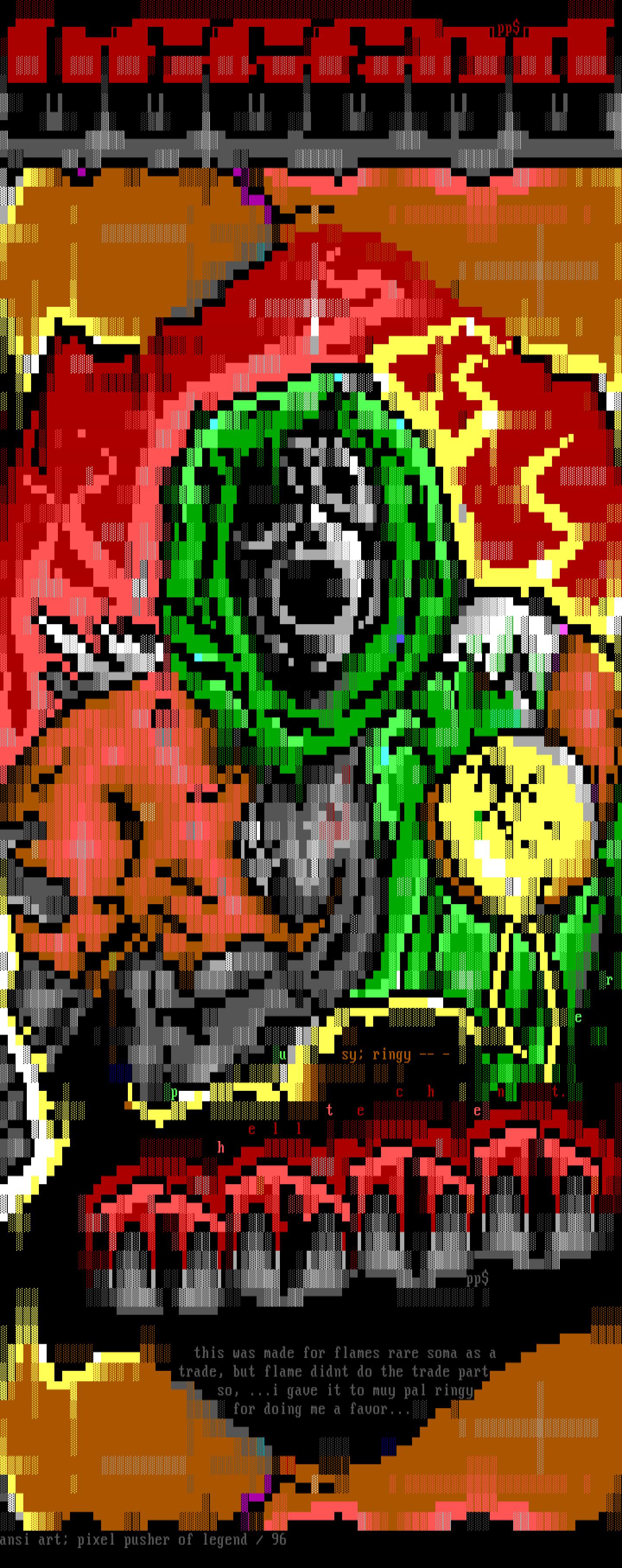 this was made for flames rare soma as a trade, but flame didnt do the trade part so, ...i gave it to muy pal ringy for doing me a favor... ansi art pixel pusher of legend / 96