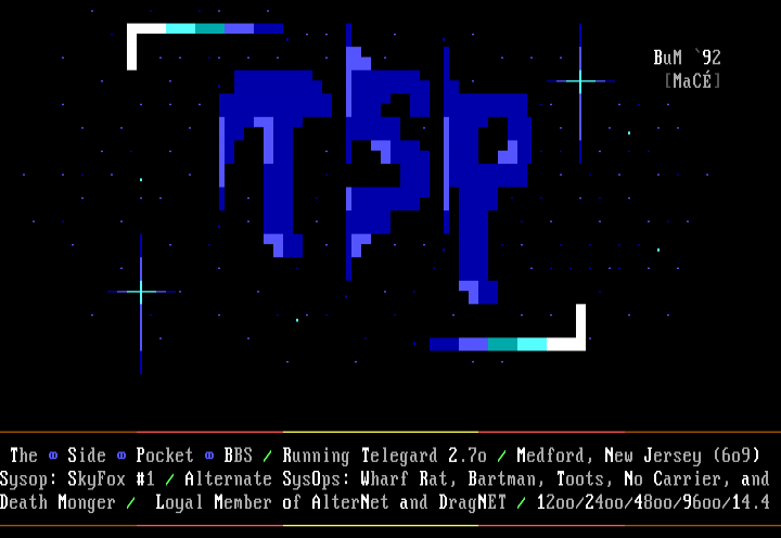 Side Pocket BBS / Running Telegard 2.7o / Medford, New Jersey 6o9Sysop: SkyFox 1 / Altern
