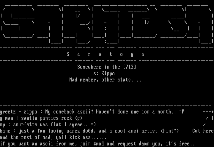 bane : just a fun loving warez do0d, and a cool ansi artist hint! Cut hereand the rest of mad, yall kick ass......