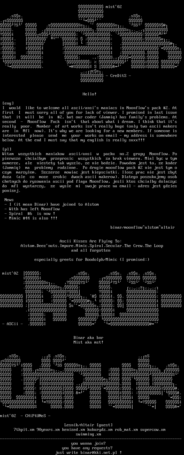 I would like to welcome all ascii/ansis maniacs in Moonflows pack 2. At