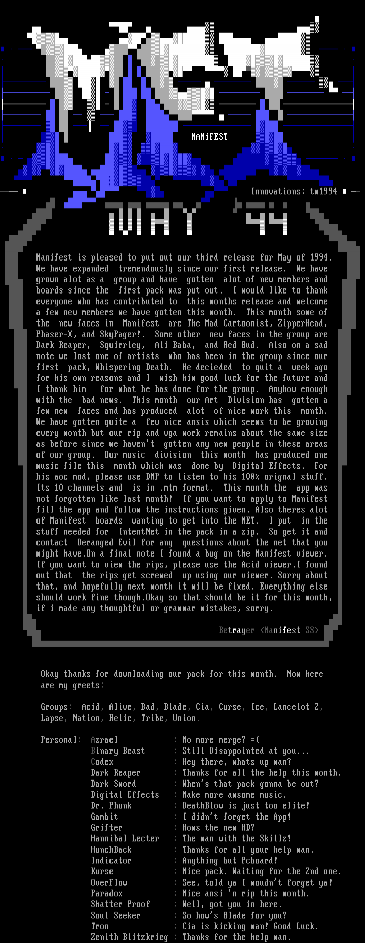 Manifest is pleased to put out our third release for May of 1994.